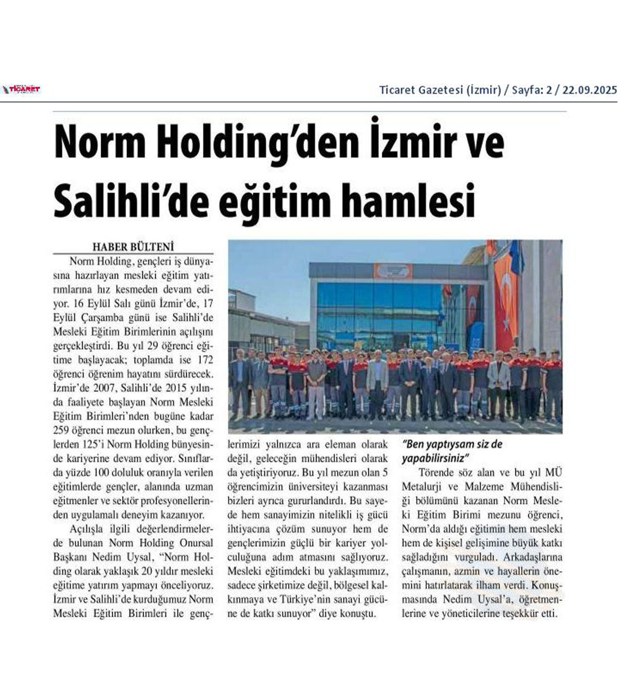 Norm Holding, İzmir ve Salihli’de mesleki eğitim yatırımlarına devam ediyor. Bu çerçevede 16 Eylül’de İzmir’de, 17 Eylül’de Salihli’de Mesleki Eğitim Birimlerinin açılışı yapıldı. Toplamda 172 öğrenciye eğitim sunan birimlerden 259 öğrenci mezun oldu, 125’i Norm Holding’de çalışmaya devam ediyor. Onursal Başkan Nedim Uysal, 20 yıldır eğitime önem verdiklerini ve bu yatırımların gençleri sadece ara eleman değil, mühendis olarak da yetiştirdiğini belirtti. Açılışta, Norm’da eğitim alan bir öğrenci de kişisel gelişimine olan katkıları vurguladı.